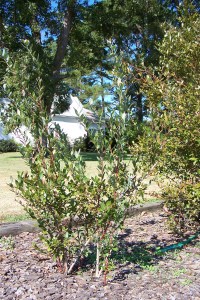 Several years after I came to live here on the farm, The Hartmans gave me some sprouts from their bushes so that I could start my own blueberry bushes to enjoy and to remember them by. As it turns out, growing blueberries in Eastern North Carolina is pretty easy. If you transplant them around Thanksgiving (right after a good hard freeze), they have all winter to establish their root system and get ready to make it through our hot, dry summers. Since they have a very shallow root system, it is critical that they have this time to set their roots before the hot weather stresses them.