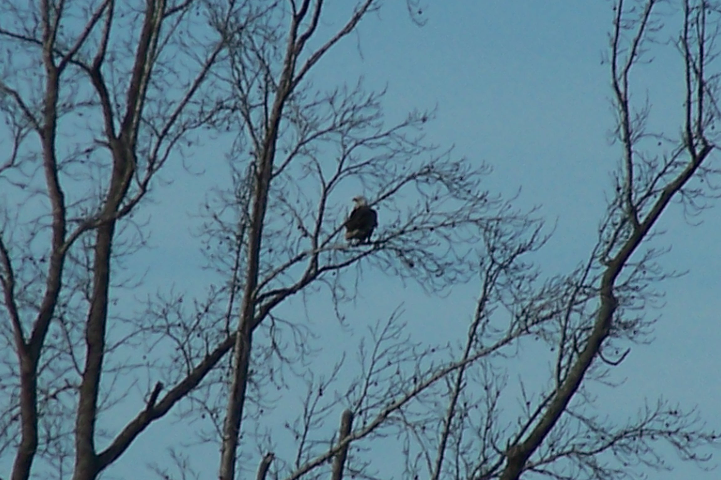 When I left that end of the house to walk to the kitchen, I looked out to discover a bald eagle (back from the day before) finishing off a carcass in the edge of the field behind the house.  I picked my camera back up and snapped 7 or 8 pictures of him.  He stayed focused on his task until I had to leave the house around 3:00 pm and at some point, a younger eagle joined him.  The mature eagle retreated and allowed the younger one to have a go at the lifeless spoils they had taken possession of.  Above a tree full of hopeful buzzards hovered, waiting for any leftovers that might be abandoned by the eagles.Eagle perched behind house 3-13